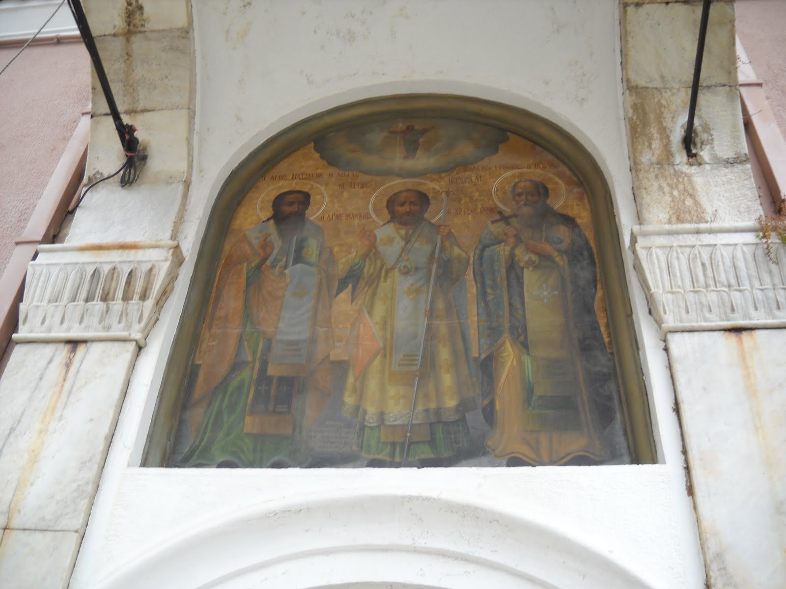 9. Η εικόνα των Τριών Ιεραρχών στο υπέρθυρο της νότιας εισόδου του ναού. (apantaortodoxias.blogspot.gr)