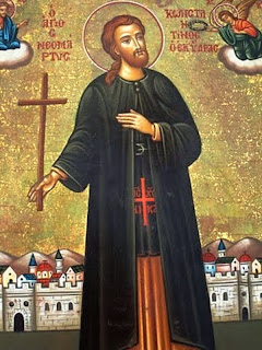 [22] Τοιχογραφία του Αγίου δια χειρός Ράλλη Κοψίδη στον εξωνάρθηκα του Καθολικού της Ιεράς Μονής Κοιμήσεως Θεοτόκου Πεντέλης Αττικής.(ngalanakis.blogspot.gr)
