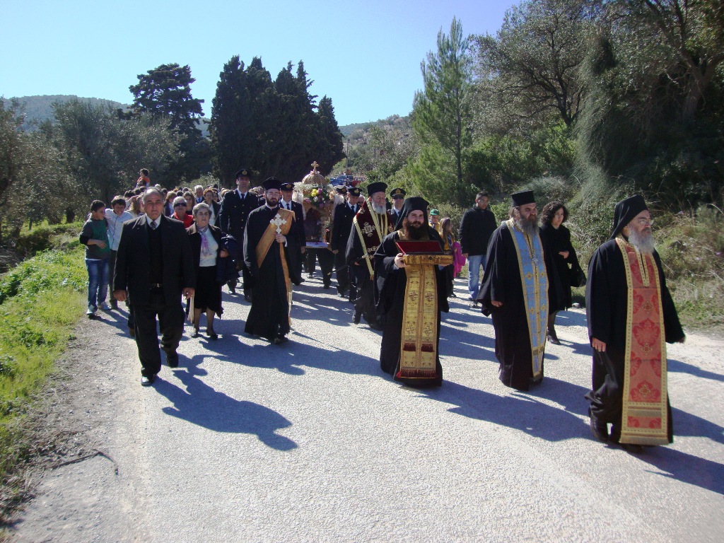 13. Στιγμιότυπο από τη λιτάνευση της παλαιάς εφέστιας εικόνος του Αγίου Ρηγίνου στη θέση «Παλιό Γεφύρι» της Σκοπέλου, όπου στις 25 Φεβρουαρίου 362 μ.Χ. έλαβε χώρα η δι’ αποκεφαλισμού μαρτυρική του τελείωση. (www.imlarisis.gr)