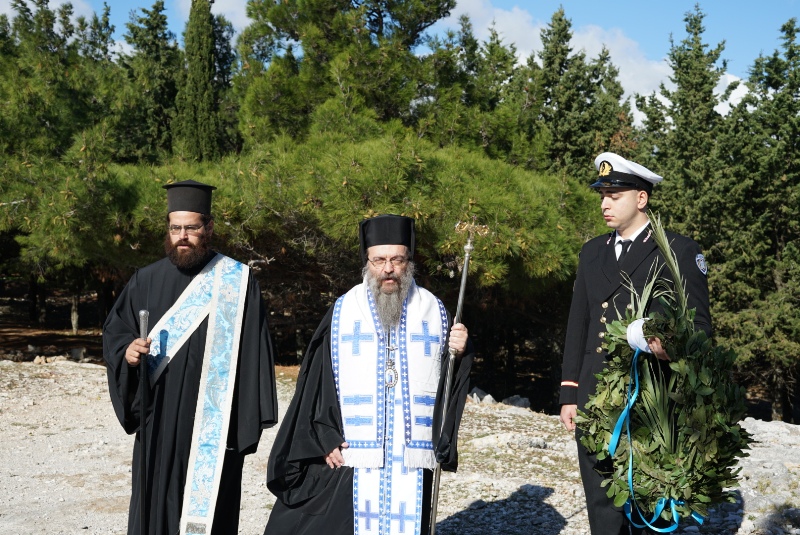 Μετά τήν δέηση ἔγινε κατάθεση στεφάνων ἀπό τόν Σεβασμιώτατο καί ἀπό τόν Πρόεδρο τοῦ Συλλόγου Σπουδαστῶν ΑΕΝ Μηχανικῶν Χίου καί ἐψάλη ὁ Ἐθνικός Ὕμνος.