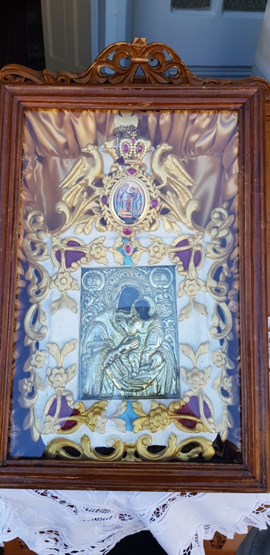 «Ὅταν ὅλα τἄσκιαζε ἡ φοβέρα καί τά πλάκωνε ἡ σκλαβιά ἀπό τόν Τοῦρκο κατακτητή, οἱ χριστιανοί τῆς Ἐνορίας μας ἔριχναν καυτά τά δάκρυά τους ἐπάνω σ’ Αὐτή τή χαριτόβρυτο Μικρή Εἰκόνα τῆς Παναγίας μας. Ὅταν ἦλθε ἡ σφαγή τήν πῆραν καί τήν ἔθαψαν σ’ ἕνα χωράφι τοῦ Τράφου, ὅπως λέγεται, βόρεια τῆς Ἐκκλησίας μας.